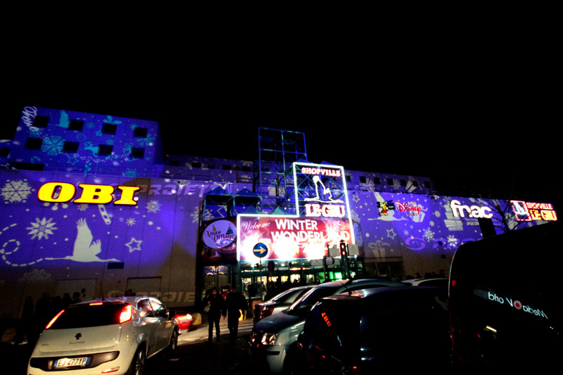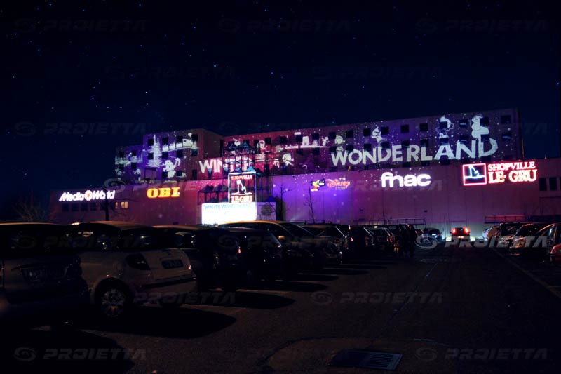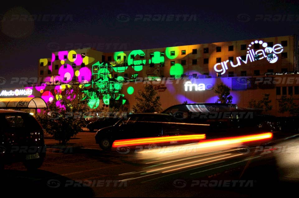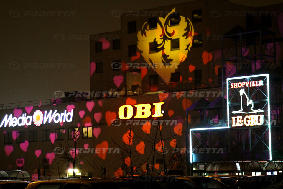 | PROIETTA has installed 12 projectors Monster 2000 creating thematic architectural projections on the facade of the shopping center Le Gru in Turin-Grugliasco. Christmas, Halloween, Valentine's Day, Festival, institutional sets, each event has been planned and designed specifically to adorn the facade of the building transforming it from year to year with ever-changing graphics and dynamic effects. This location is a great example of anonymous architecture, through the architectural projections, it becomes a perfect screen to project advertising of events, Christmas lights, decorative and graphic themes and attract the customers's attention. |