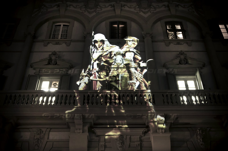 Ubisoft ha scelto PROIETTA per realizzare una serie di proiezione di loghi e personaggi del noto video games Assassin's Creed. Le proiezioni sono state realizzate in occasione di Lucca Comics & Games 2012 sulle mura della città e sugli edifici del centro storico. Per la proiezione sono stati utilizzati proiettori Monster 1200 - 2000 e gobos personalizzati a due e tre colori.
